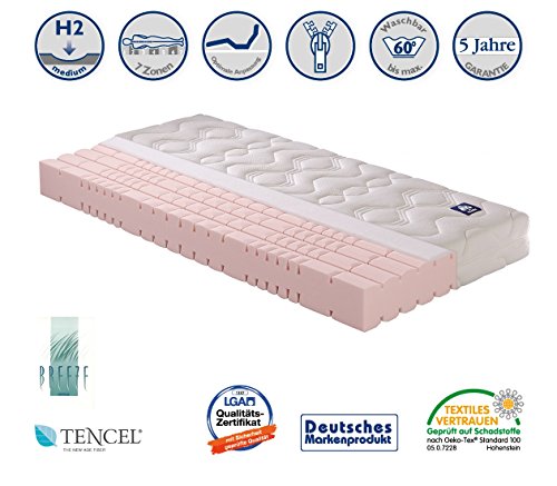 Irisette Lotus 7-Zonen Kaltschaummatratze mit ca. 16 hohem Kaltschaumkern im Raumgewicht 55. Auf ihr fühlen sich selbst Schläfer mit sehr hohem Komfortanspruch ideal aufgehoben. Durch die hygienische Waschbarkeit ist sie auch für Allergiker bestens geeignet. Die Matratze ist sehr gut in Verbindung mit verstellbaren Lattenrosten verwendbar.   extrem punktgenaue Körperanpassung – dank spezieller Einschnitte in 3D-Würfelschnitt-Technologie wird die Oberflächenspannung aufgebrochen und die Matratze kann sich punktgenau an die Körperkontur anpassen sehr guter Feuchtigkeitstransport permanente Absorption von Gerüchen dank Breeze-TechnologieDer Bezug besteht aus Breeze-Doppeltuch, 45% Lyocell, 28% Polyamid, 25,5% Polyester und 1,5% Elasthan und ist beidseitig mit Klimafaser versteppt. Er ist durch den 4-seitigen Reißverschluss bequem abnehmbar und lässt sich bei 60° hygienisch waschen. Matratzenhöhe ca. 20 cm. Härte 2 = für Körpergewicht bis ca. 80 kgHärte 3 = für Körpergewicht bis ca. 100 kg
